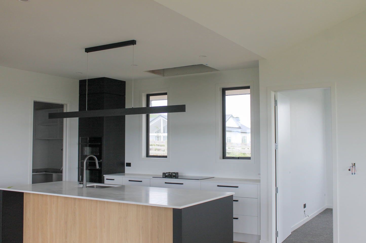 A large family home built by Classic Builders nestled amongst the hills of Waiuku with expansive views. The kitchen features gunmetal fittings and hardware, black, white and timber cabinetry, marble stone benchtops and beautiful Quickstep laminate flooring. The exterior is a combination of black bricks, James Hardie Oblique painted in Flaxpod as well as Flaxpod joinery, a Flaxpod Colorsteel roof and a Sandstone Grey garage door & front door.The exterior really is the epitome of a soft black beauty.